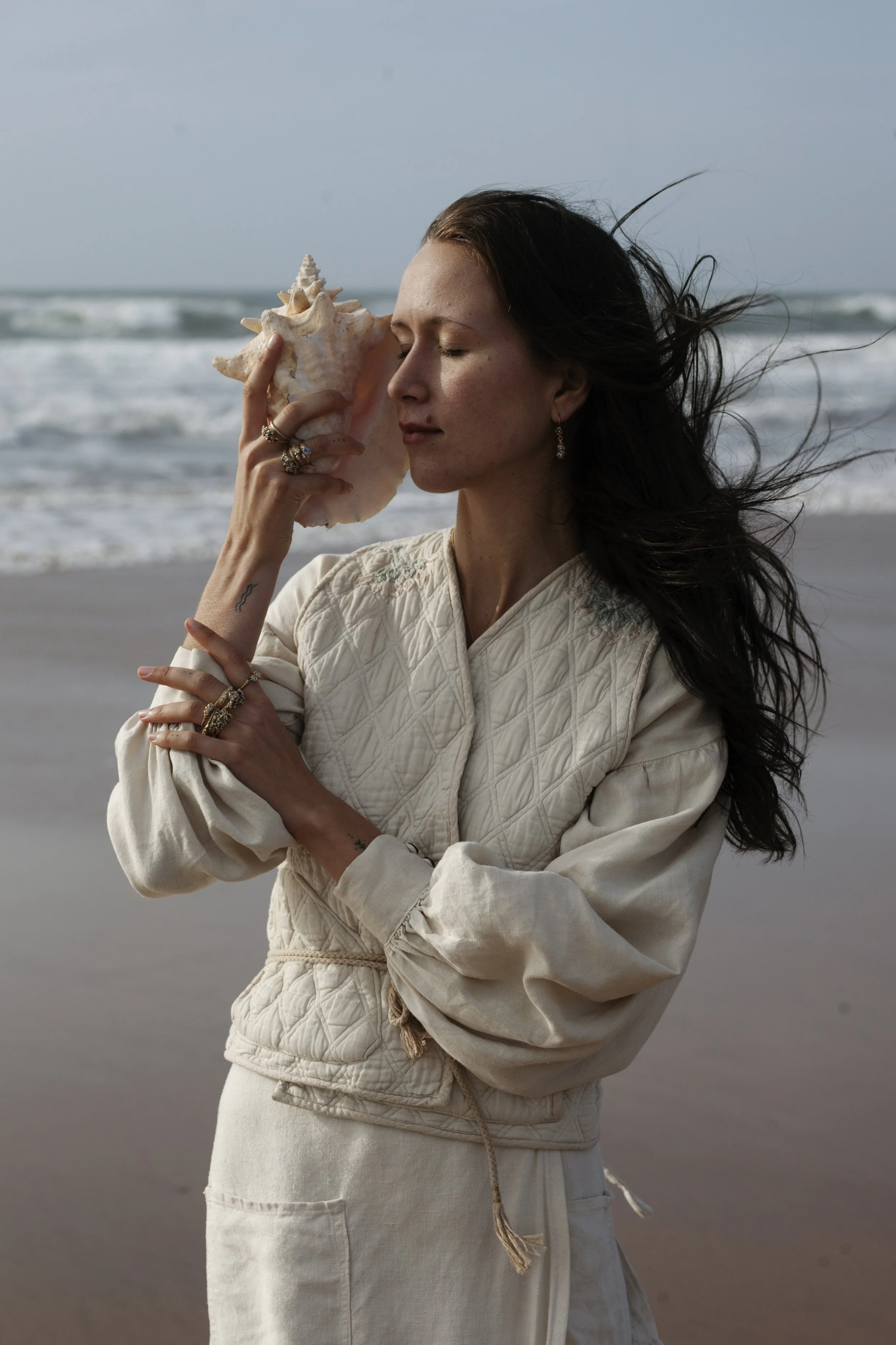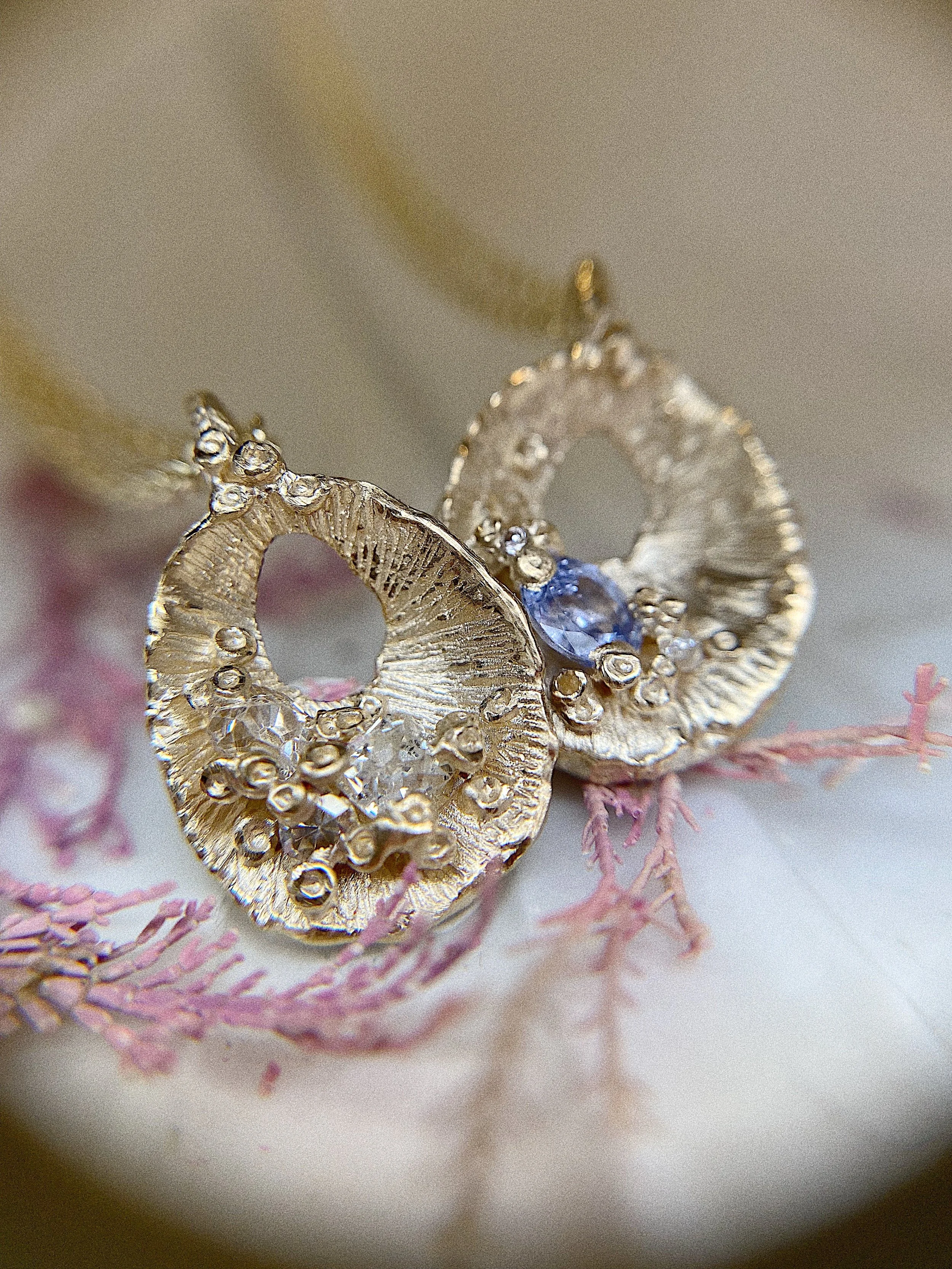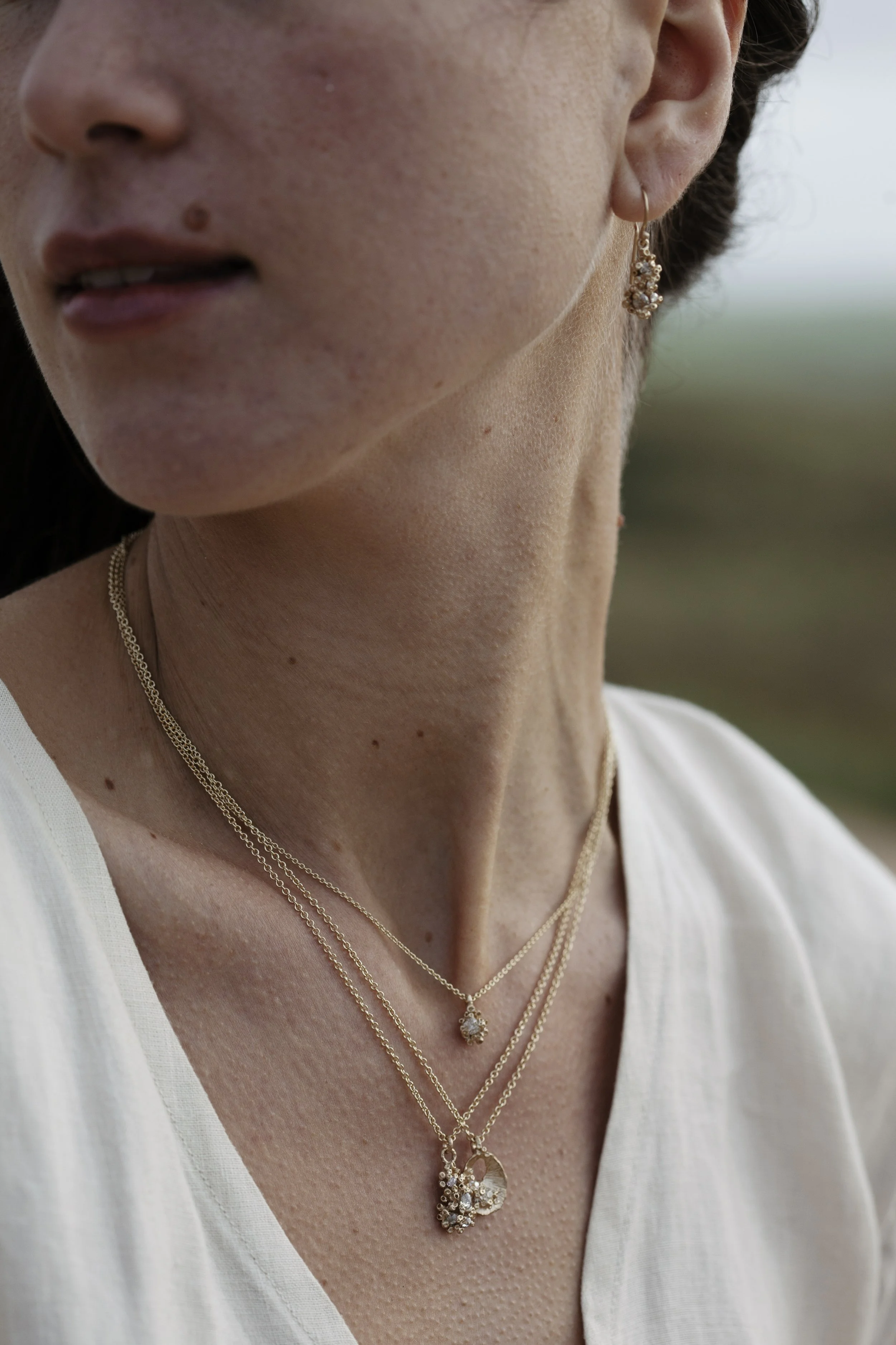 Born in Pembrokeshire West Wales, Ami’s collections of unique & sculptural pieces of jewellery explore the intricate cluster formations of shells. Ami’s fascination with their formations stem from her childhood memories of beach combing along the Pembrokeshire coast. The cycles of the tides washing ashore organic forms offered intricate textures and tones in her finds. Ami sculpts her jewellery through meticulous hand carving, casting into metal and encrusted with stones, to form precious yet organic compositions.
