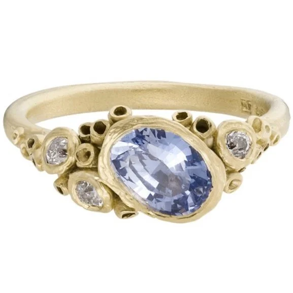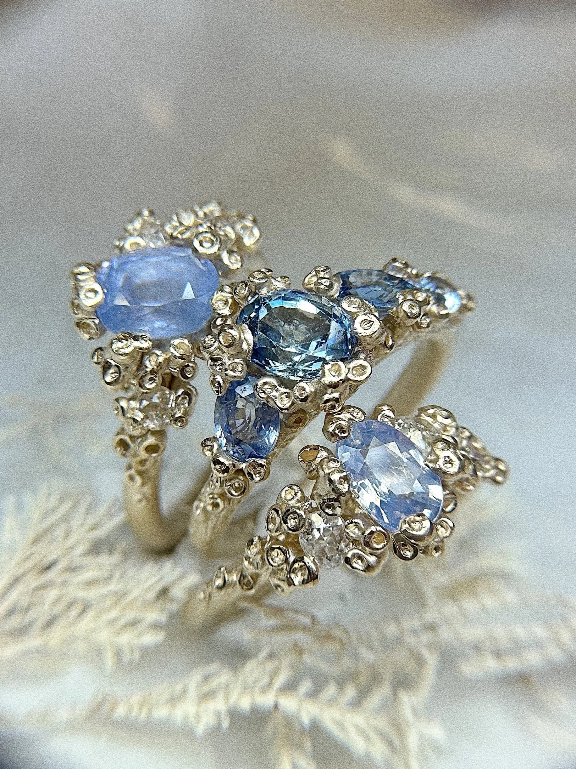 Barnacle cluster ring in 9k yellow gold with 1.35 ct. light blue sapphire and 0.19 ct. t.w. diamonds, £2,720 ($3,390); Ami Pepper