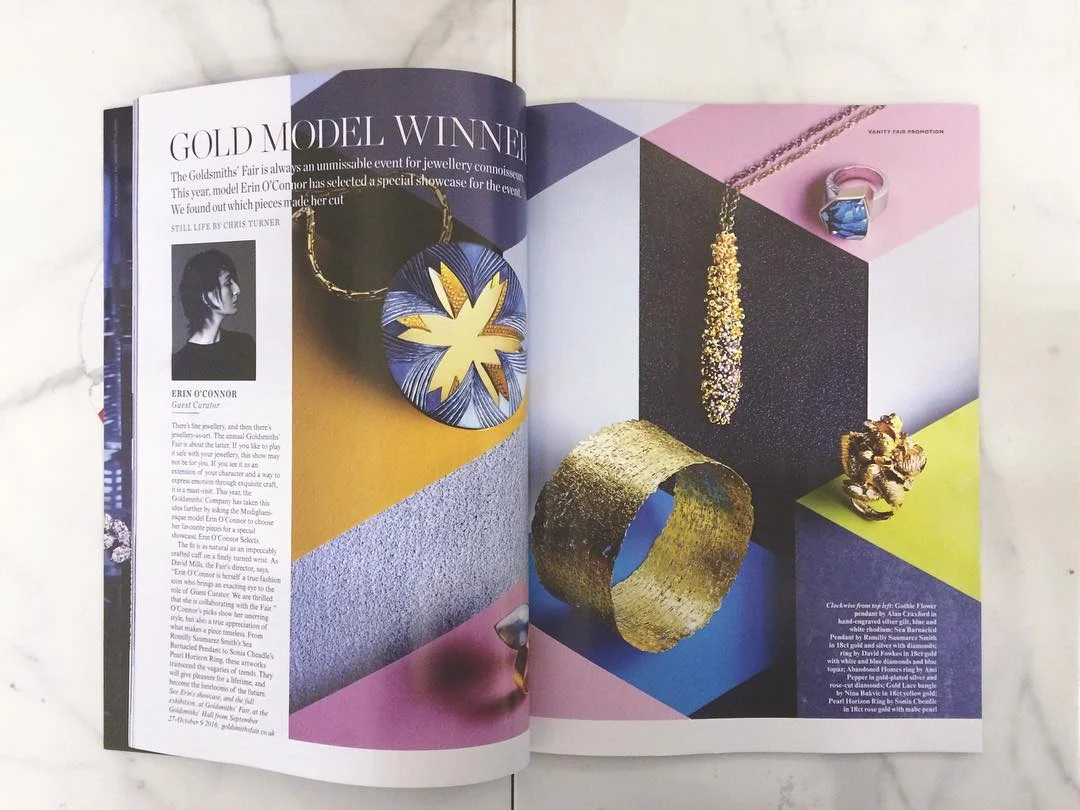 I am so thrilled to be featured in August's '16 Issue of Vanity Fair on Jewellery! The article is on Goldsmiths Fair and this years invited Guest Curator Erin O'Connor. I am featured in good company of fellow jewellers and honoured to have made her cut!