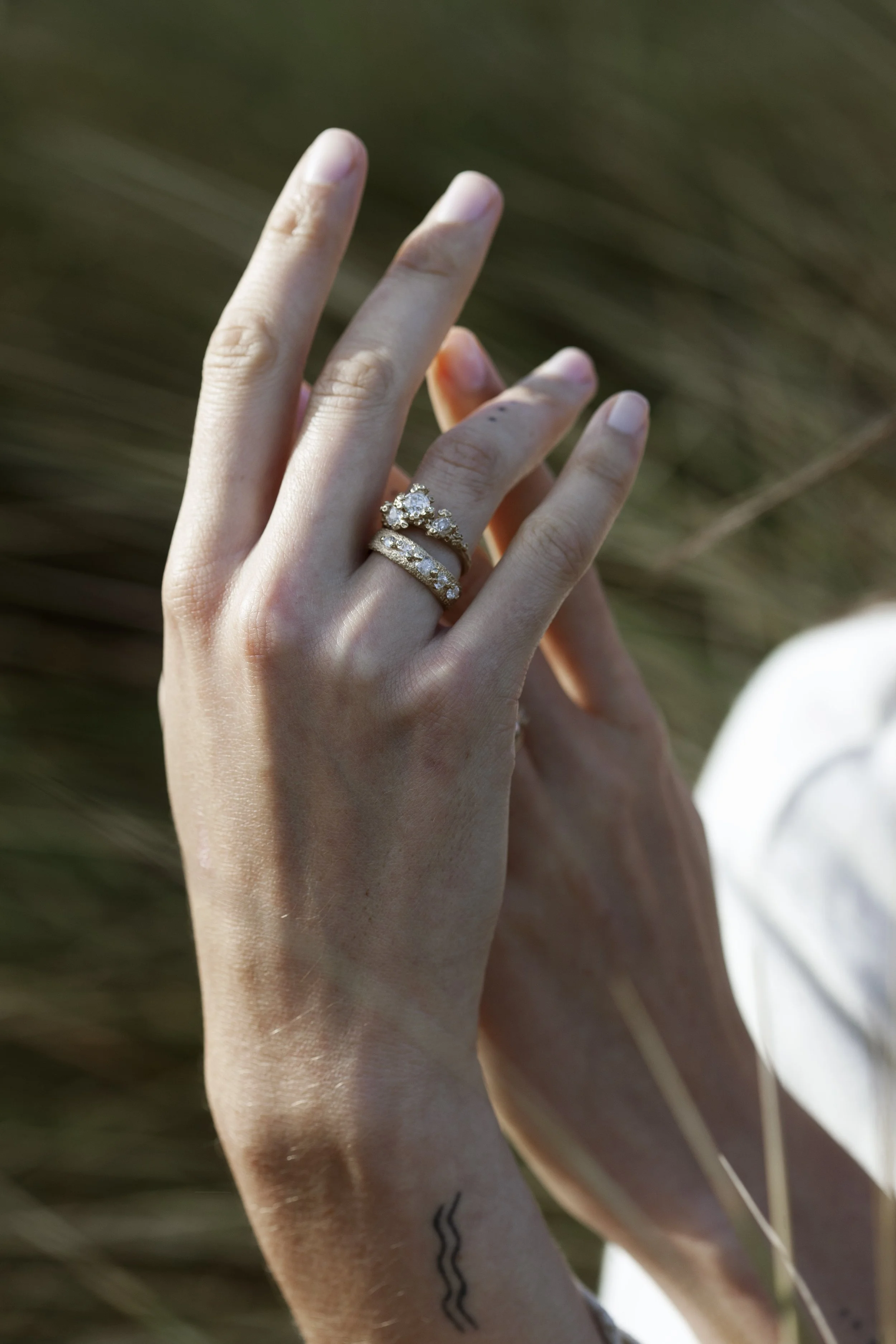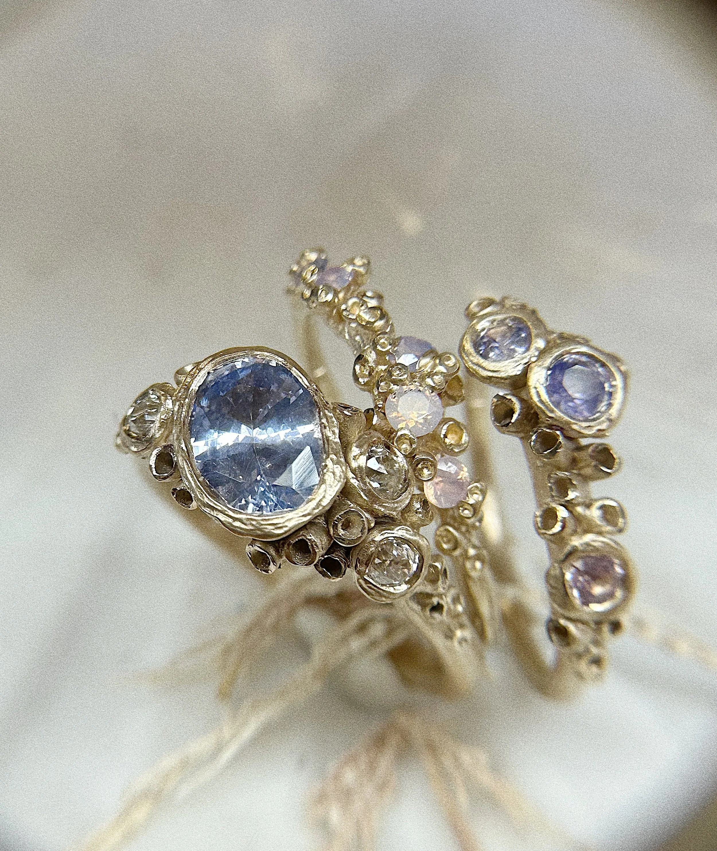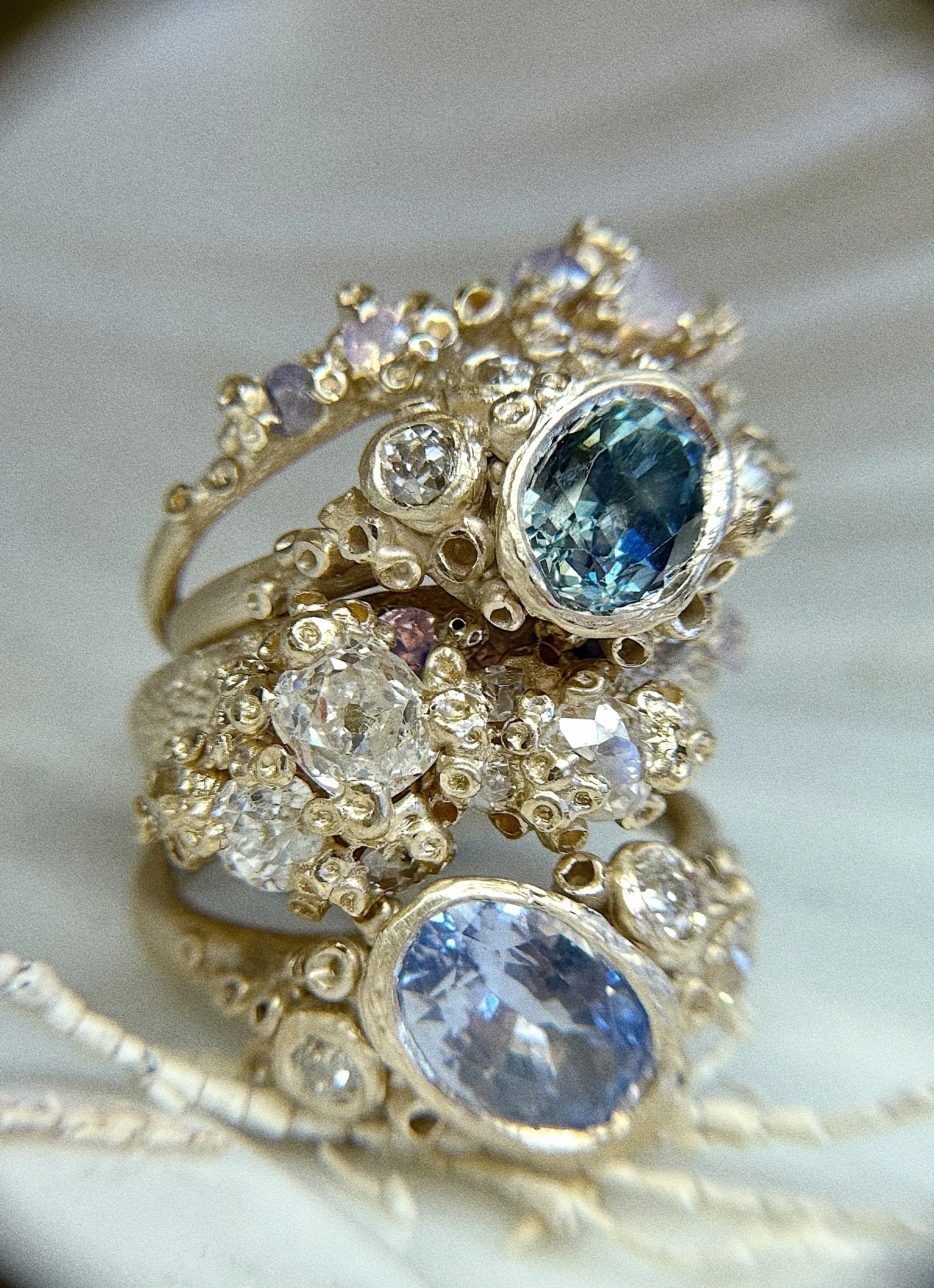 Her studio sits above the West Wales Arts Centre, a gallery run by her parents in Fishguard. it overlooks Lower Town and Dinas Island. ‘an ever-chaining expanse of sky and sea’ that is reflected in her jewellery by the hues of the stones : green and blue sapphires, and diamonds in soft tones such as white and pink that evoke clouds and sunsets. When working on a new piece, Ami arranges any inspiring seaside finds in her workbench and models her design in wax. She adds the stones and melts the wax around them to build an organic shape. She sends the finished model to Birmingham’s Jewellery Quarter, where a mould is made and filled with molten gold in a process called lost wax casting. if her design calls for the stones to be removed before casting, she encrusts the gold piece with gems on its return. The majority of Ami’s work is bespoke commissions, including engagement and wedding rings. Clients often send her sand from their favourite beach to embed into sentimental jewellery. ‘People like the idea oof holding something within them,’ she says. Ami carries her own costal surroundings into all her work.