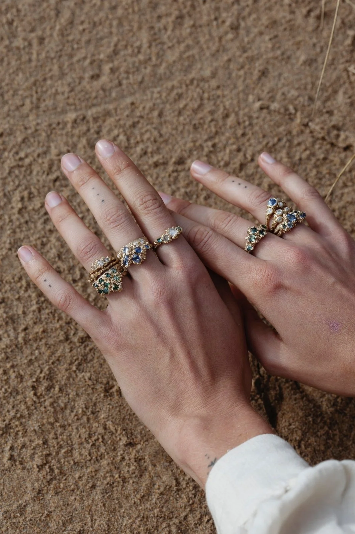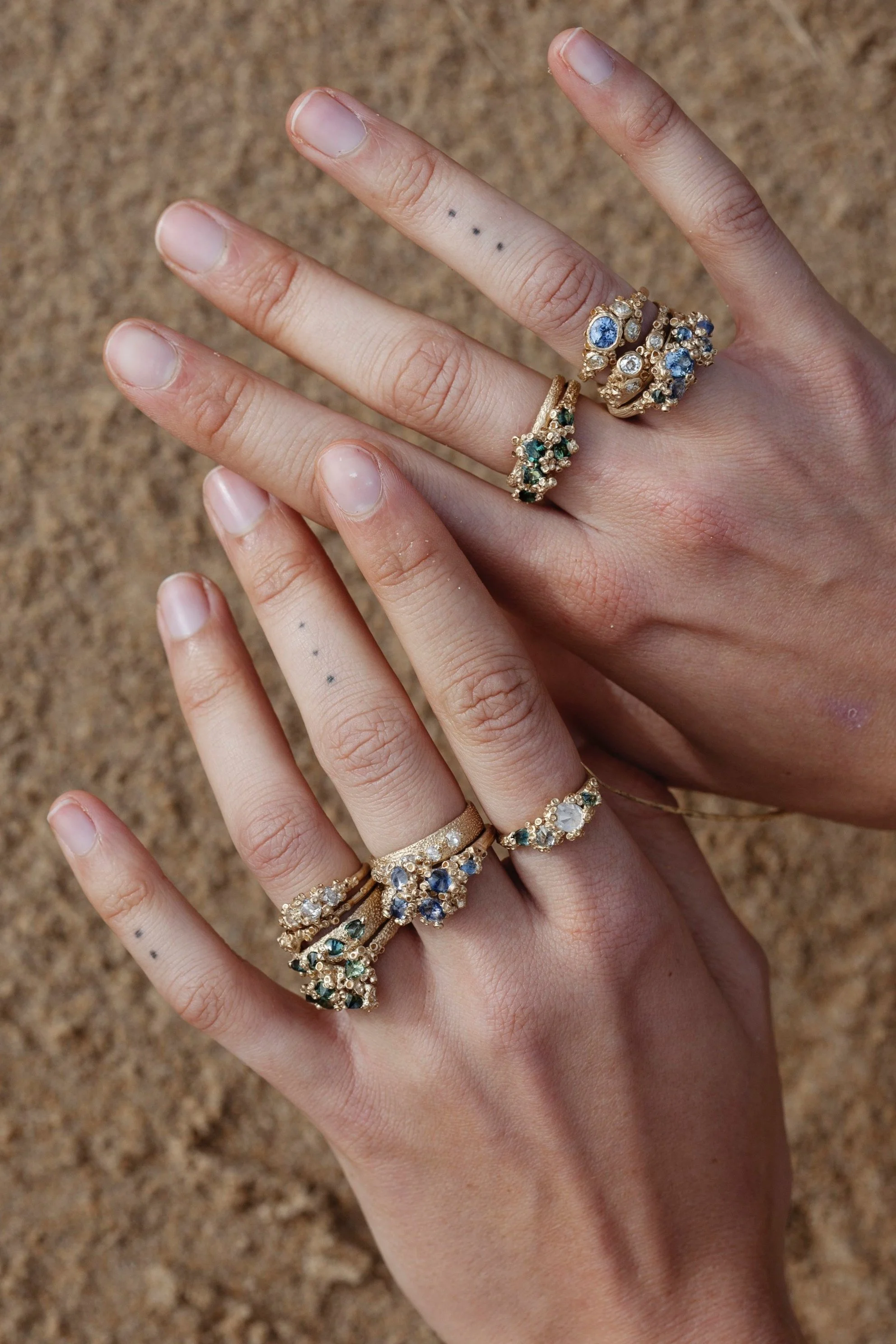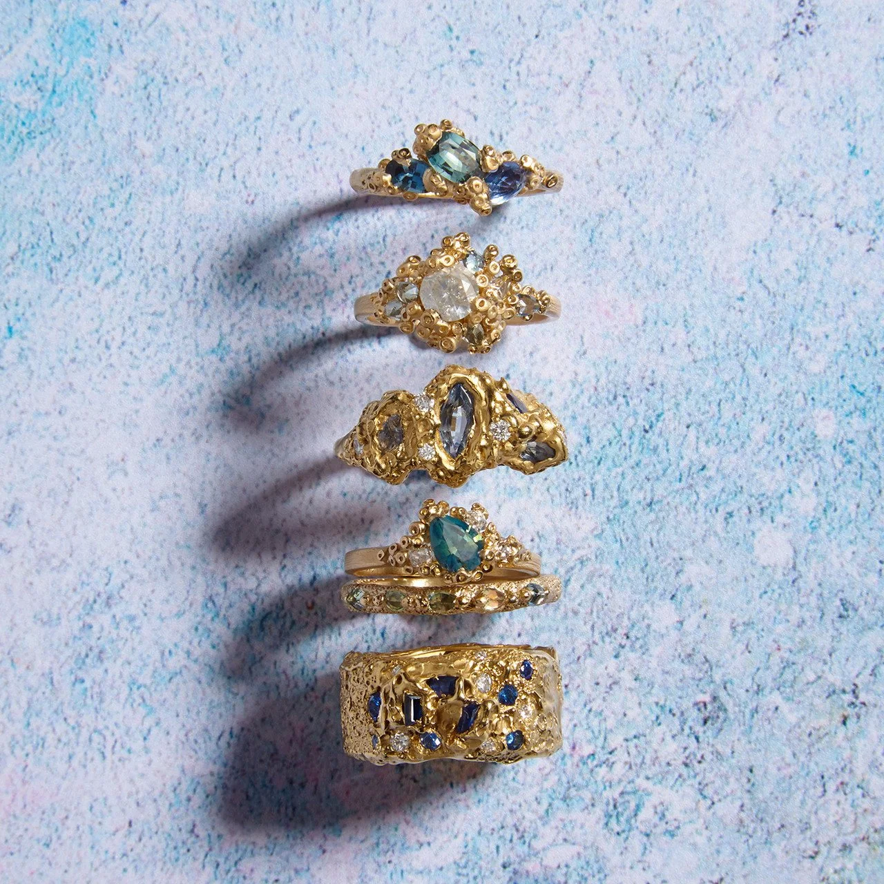 to ask her to create the perfect oceanic ring for our Treasury. Encapsulating the beautiful gems that I selected in Fairtrade gold transports me to hazy days of rock-pooling and treasure seeking. A true One of a Kind. ” Sarah Burns, Director, Gill Wing Jewellery.