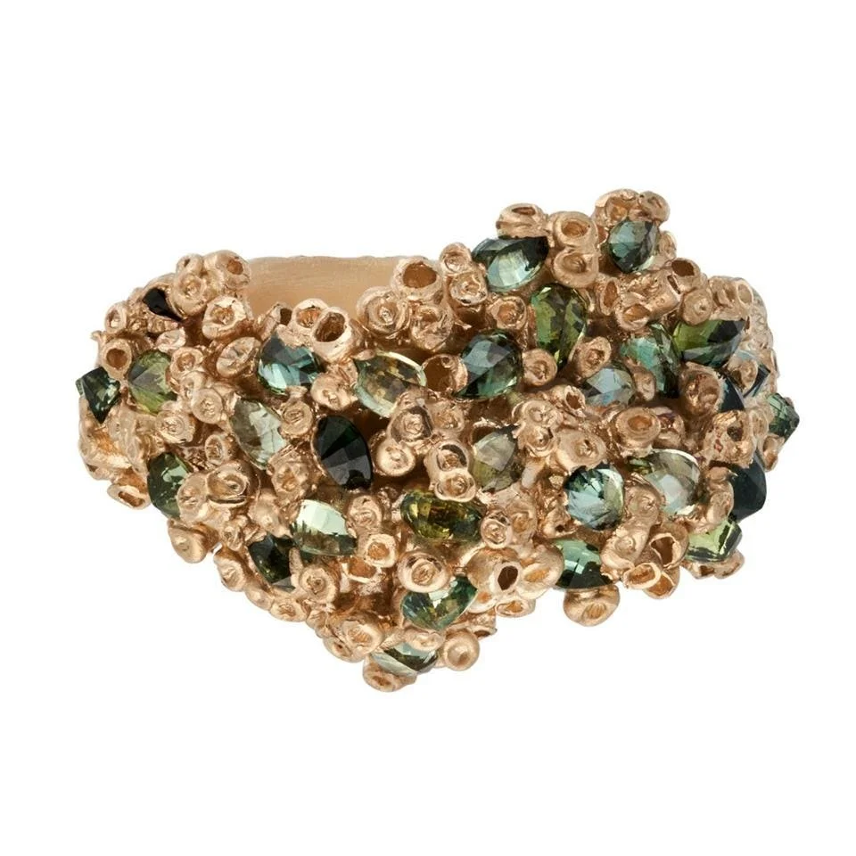 Full of hand-worked texture and granulation, this ring draws on the designer’s childhood memories of beachcombing in Wales, and the shells and creatures she found there. “By studying the traces of the tides and colours of the landscape, the ring encapsulates an essence of the raw, organic treasure, encrusted with barnacles like a shell would be over time under the sea,” says Pepper of the jewel, which sees green sapphires of varying hues bursting out from tiny pipes and bubbles of 9kt gold.